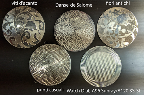 The Enamel Tech Talk sidebar called Engine-Turning Machines For Guilloché (page 44) goes over the 3 types of machines that produce patterns for Guiloché. Most buttons have radial designs which are from the Rose engine. The Straight-line engine produces fancy lines that are parallel and I have at least one button from that machine (button 348, page 83). The Brocade engine has much more complex designs and cannot always be identified as Guilloché without being told. Here are metal pieces I just bought to make buttons. These were done by engine-turner Tig Lichty. Note: all in the photo are done by a Brocade engine except the lower right which was from both a Rose Engine (radial border) and a Line Engine (center pattern).