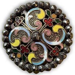 Note the word: "engraved" in the paragraph above. This means that the lines are cut INTO the metal surface and are thus indented. No Guilloché pattern is raised above the surface as that would have resulted by an embossing/casting method. Another tell is if the indented lines are curved at the bottom, not sharp - remember that Guilloché is as bright as it is becuase the engraving is at an angle and sharp so that the light reflects brilliantly through the enamel. Be sure to keep these concepts in mind when purchasing a button labeled as Guilloché.