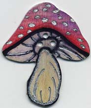 Toadstool shaped aluminum decorated with PrismaColor colored pencil, ink and a clear protective coat; 3 hole sew-through.