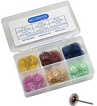 This tool comes with lots of bits, mostly diamond, WHICH WILL damage enamel if used on it. The polishing tools I recommend are called 3M Radial Bristle Discs*. You do not need to buy a kit, as you only need certain colors. Mandrels to put these on will also be needed. The 3/4" size is good for your needs on buttons. You can use the yellow (80 grit), red (220 grit), blue (400 grit), and light green (1 micron). More than one head can be put on the madrel at one time, thus see what works best for you.